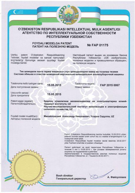 1. Ташболтаев М.Т., Усаров С. А.Н.Михайловский. Пахта далаларини машина теримига тайёрлаш ва теримни сифатли ўтказишга доир тавсиялар. – Тошкент, ТҚХТЗ, 2017. – 60 б. 2. Михайловский А.Н., Усаров С. О работе хлопкоуборочного аппарата с 14-ти шпиндельными барабанами. “Фан-техника, таьлим ва технологиялар: долзарб муаммолар ва ривожланиш тенденциялари” мавзусидаги илмий-техник анжумани материаллари тўплами (2-қисм). –Джизак, 2017. – Б. 207-210. 3. А.Н.Михайловский, С.Усаров. О возможности совершенствования хлопкоуборочных машин. “Фан-техника, таьлим ва технологиялар: долзарб муаммолар” мавзусидаги илмий-техник анжумани материаллари тўплами (2-қисм). – Джизак, 2017. – Б. 203-206. 4. С.Усаров, А.Н.Михайловский. Результаты и направления НИР по совершенствованию хлопкоуборочных машин. “Юқори самарали қишлоқ хўжалик машиналарини яратиш ва улардан фойдаланиш даражасини ошириш” республика илмий-амалий конференцияси илмий мақолалар тўплами. – Гулбаҳор, 2017. – Б. 205-209. 5. С.Усаров, А.Н.Михайловский. Эффективность работы хлопкоуборочного аппарата с гидрокопиром. “Юқори самарали қишлоқ хўжалик машиналарини яратиш ва улардан фойдаланиш даражасини ошириш” республика илмий-амалий конференцияси илмий мақолалар тўплами. – Гулбаҳор, 2017. – Б. 213-217. 6. С.Усаров, А.Н.Михайловский. Тик шпинделли пахта териш аппаратини такомиллаштириш // Агро илм, 2017. – № 3 – Б. 102-103. 7. С.Усаров, А.Н.Михайловский. Тик шпиндели пахта териш аппарати учун пахтани ерга тўкилишини камайтирувчи қурилма // Инновацион ғоялар, технологиялар ва лойиҳалар X Республика ярмаркаси банери. – Тошкент, 2017. 8. С.Усаров, А.Н.Михайловский. Тик шпиндели пахта териш машинаси учун пахтани ерга тўкилишини камайтирувчи қурилма // Инновацион ғоялар, технологиялар ва лойихалар 10 республика ярмаркаси . Иновацион ишланма буклети. –Тошкент, 2017. –5 б. 9. Михайловский А.Н. Усаров С. “Система обмыва и очистки шпинделей вертикально-шпиндельной хлопкоуборочной машины”. Патент № FАР 01175, Бюл. № 3, 31.03.2017 г. 10. А.Н.Михайловский, С.Усаров. Об обеспечении стабильности работы вертикально-шпиндельных хлопкоуборочных машин. «Научно-практические пути повышения экологической устойчивости и социально-экономическое обеспечение сельскохозяйственного производства». Международная научно-практическая конференция, посвящённая году экологии в России. Прикаспийский НИИ аридного земледелия. – Соленое Займище, - 2017, С. 1208-1211. 11. Михайловский А.Н., Усаров С. «О стабильности работы вертикально-шпиндельных хлопкоуборочных машин». Международная научно-практическая конференция «Актуальные вопросы в науке и практике», г. Самара., 2018, С. 60-66. 12. Усаров С., Михайловский А.Н. «Совершенствование технологии машинного сбора урожая хлопчатника». Международная научно-практическая конференция «Перспективы развития науки в современном мире», г. Уфа.,- 2018, С. 48-55. 13. Усаров С., Михайловский А.Н. «О технологиях уборки урожая хлопчатника». Международная научно-практическая конференция. «Итоги и перспективы развития агропромышленного комплекса». Прикаспийский НИИ аридного земледелия. – Соленое Займище, - 2018, С. 667-670. 14. Усаров С., Михайловский А.Н. «Некоторые особенности машинной уборки хлопка». Международная научно-практическая конференция. «Итоги и перспективы развития агропромышленного комплекса». Прикаспийский НИИ аридного земледелия. – Соленое Займище, - 2018, С.